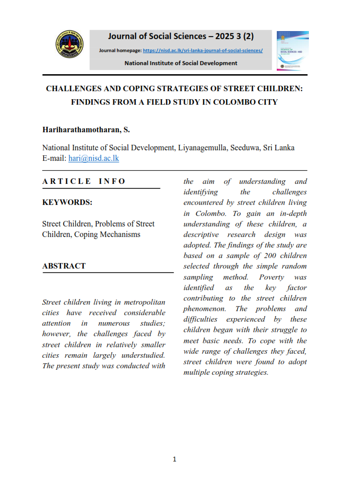 Hariharathamotharan, Senior Lecturer, Social Development Policy, Research and Publications Division, National Institute of Social Development, Liyanagemulla, Seeduwa, Sri Lanka