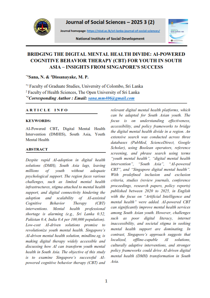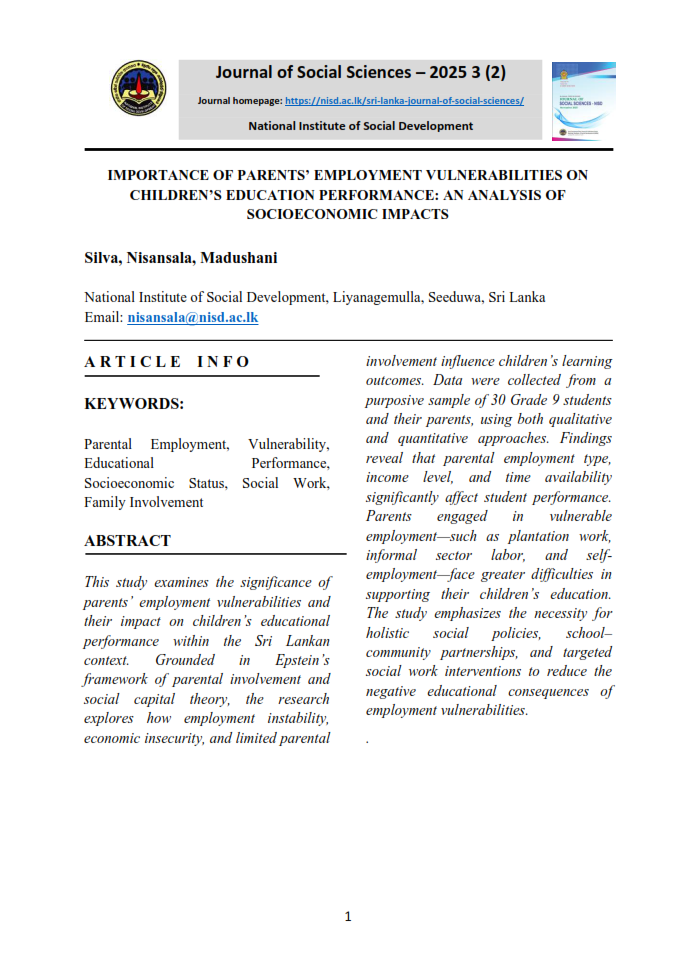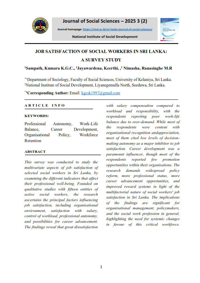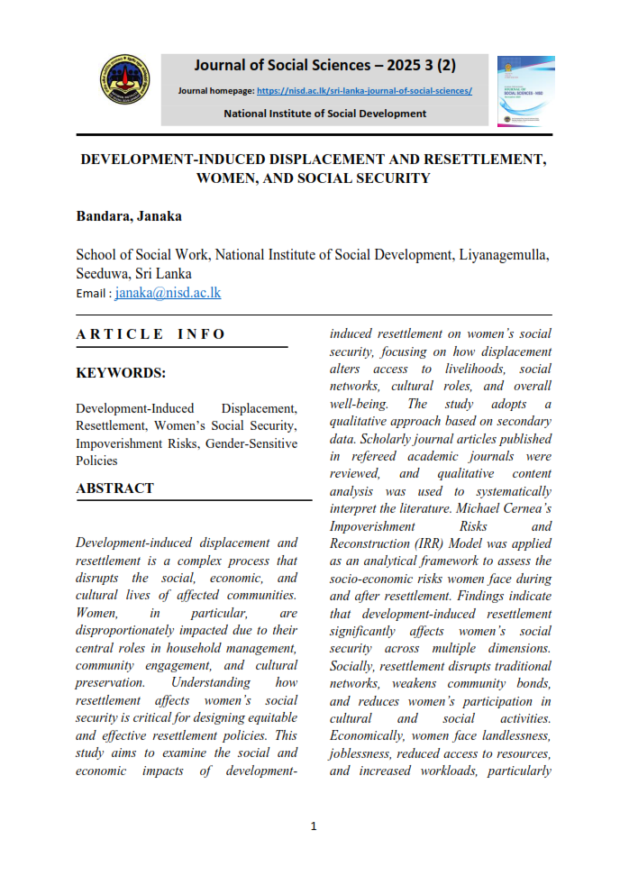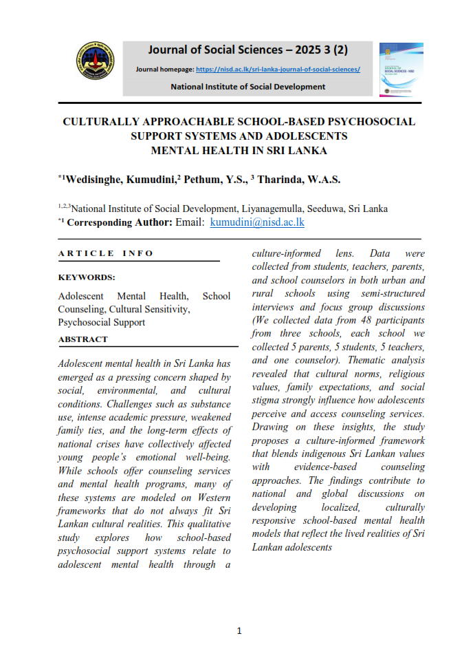 B.A. Niluka Wijebandara, Lecturer, Social Development Policy, Research and Publications Division, National Institute of Social Development, Liyanagemulla, Seeduwa, Sri Lanka. Email : niluka@nisd.ac.lk