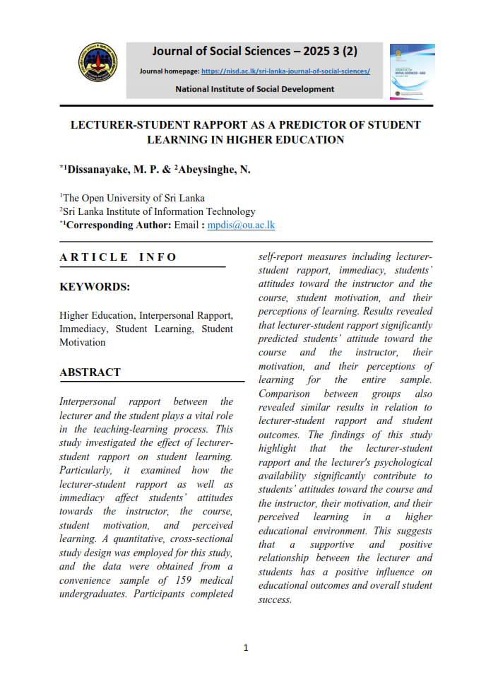 KEYWORDS: Higher Education, Interpersonal Rapport, Immediacy, Student Learning, Student Motivation Corresponding author : Dissanayake, M. P., Email : mpdis@ou.ac.lk |