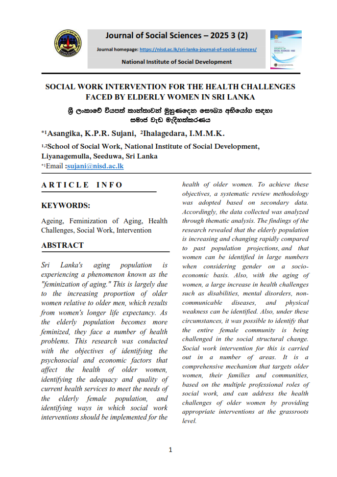 KEYWORDS: elderly women, challenges, social isolation, gender-based discrimination, healthcare Corresponding author : Niroshika D.1, Email : deepthi@nisd.ac.lk |