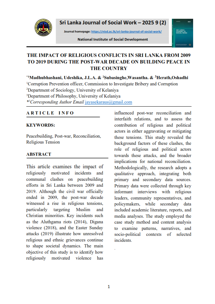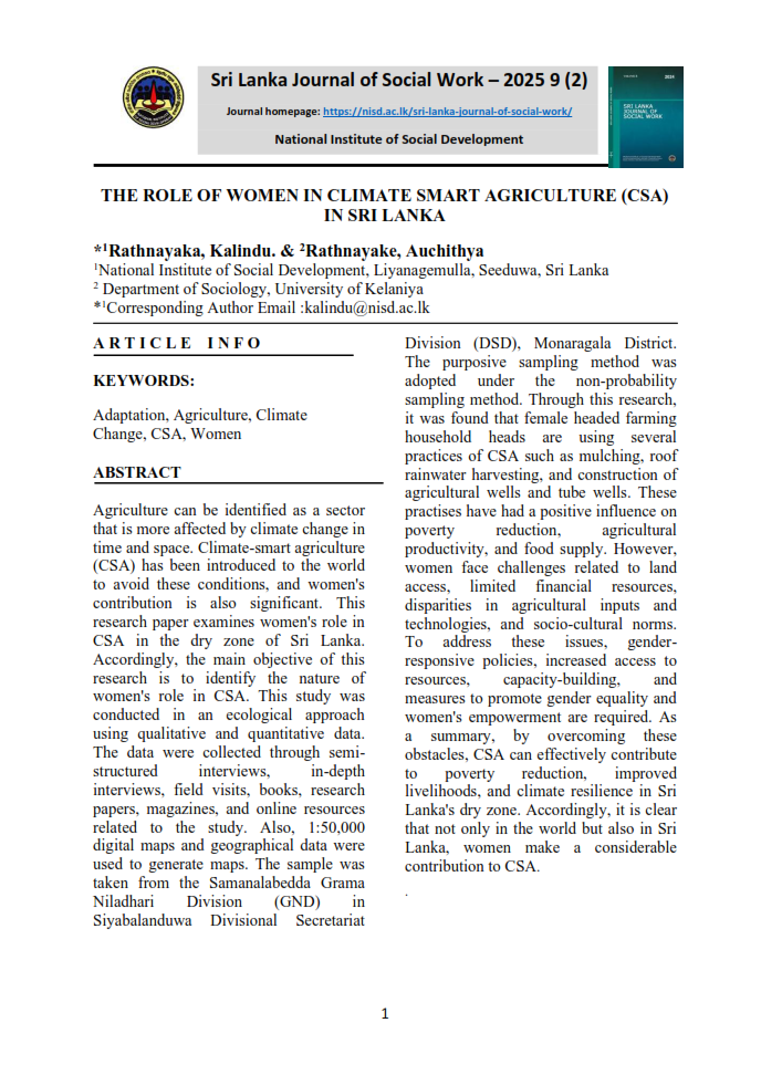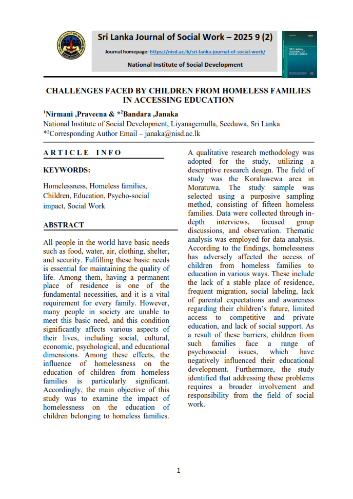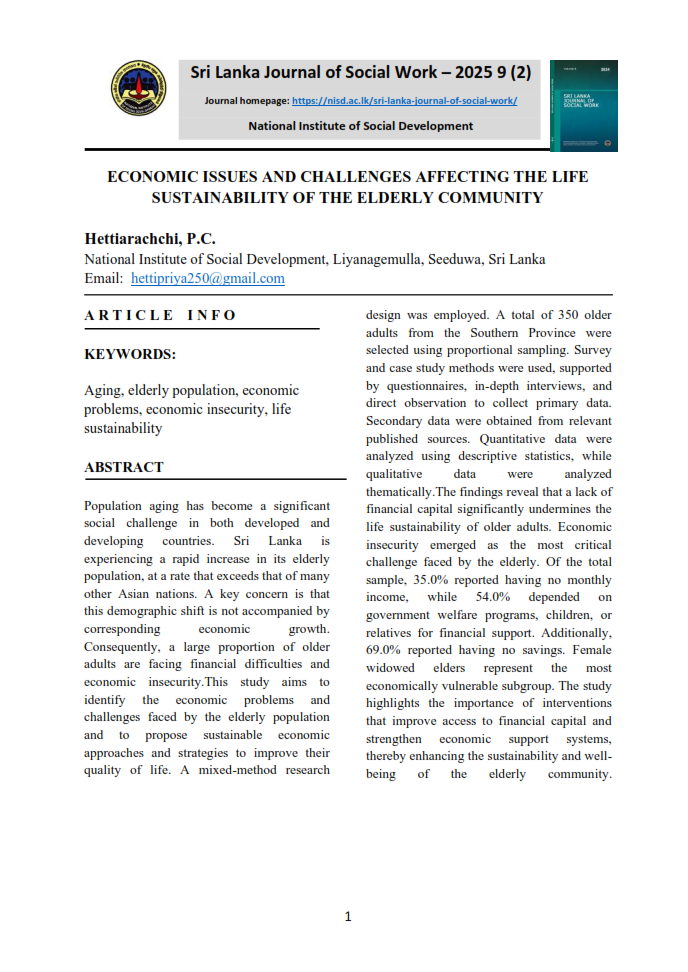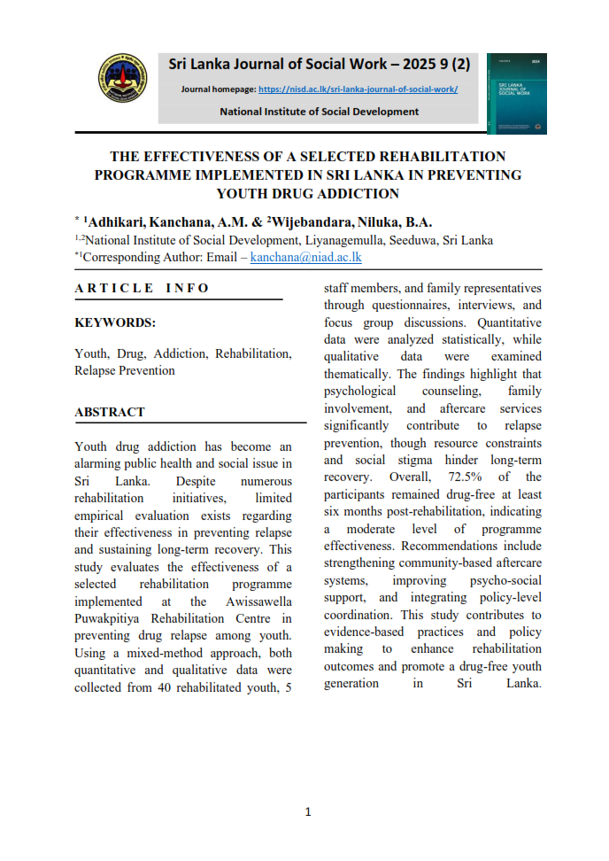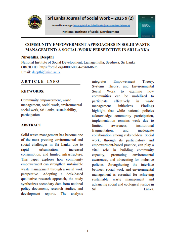 The Sri Lanka Journal of Social Work, published by the Social Development Policy, Research and Publications Division of the National Institute of Social Development (NISD), serves as a premier academic platform for advancing knowledge in social work, social policy, and social development. It provides a forum for scholars, practitioners, and policymakers to engage in meaningful discourse on contemporary social challenges and emerging trends within the discipline. The journal aims to promote evidence-based practice, inspire research-driven solutions, and foster innovative approaches to enhance the well-being of communities in Sri Lanka and beyond.